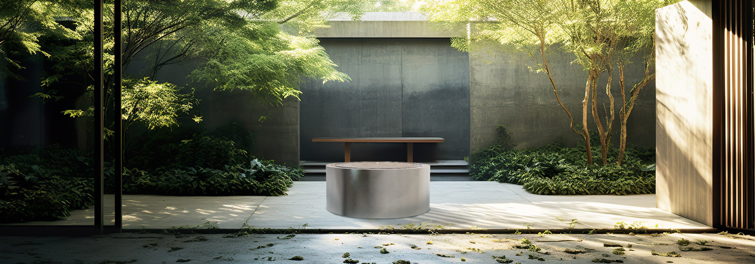 La hoja en blanco se transforma en suaves piezas escultóricas, mientras que el acero inoxidable altamente pulido refleja su entorno, adaptándose a los cambios estacionales y convirtiéndose en parte integral de los mismos.